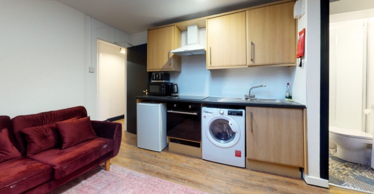 The open-plan kitchen and lounge is a welcoming space to relax and unwind, featuring a sofa, dining table and a smart TV with TV licence. The kitchen is well-equipped with an oven, microwave, fridge freezer and a combined washer/dryer, plus ample cupboard storage.