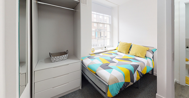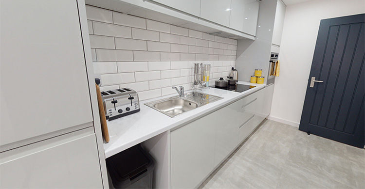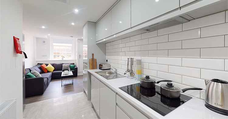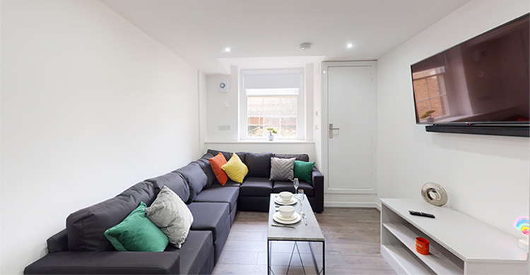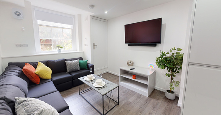 The communal open-plan lounge and kitchen are fully equipped with high-end fixtures and features including a plush sofa, a 50" smart TV accompanied by a premium soundbar, an oven, hob, microwave, dishwasher and a full-size fridge-freezer. Cupboard space? There’s plenty for everyone.